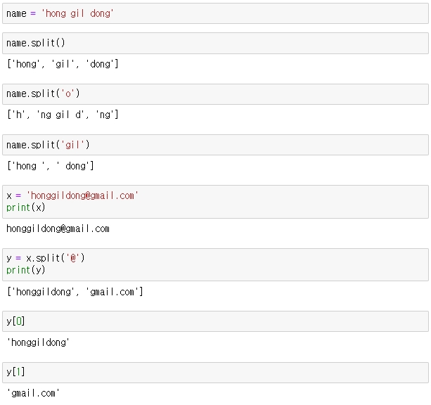 - 아래 예에서, 문자열을 특정 문자열로도 나눌 수 있다. 'gil'로 나누면, 2개의 단어로 분리됩니다. split('gil')