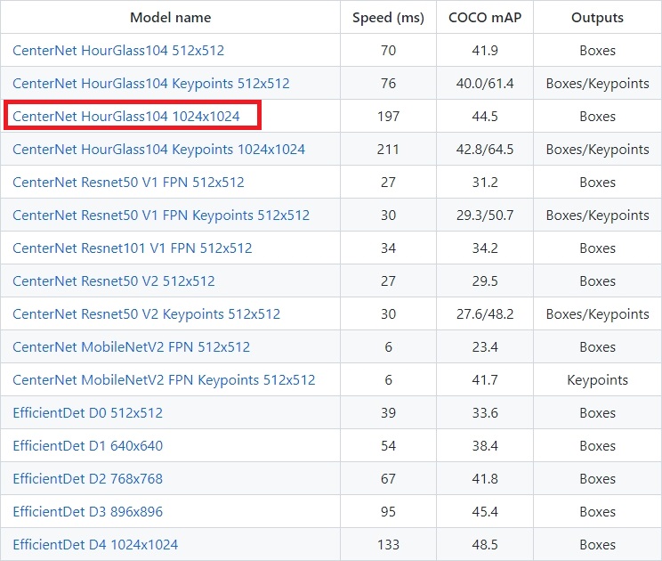 제가 보여드릴 예제는 3번째 CenterNet HourGlass104 1024x1024 입니다.
