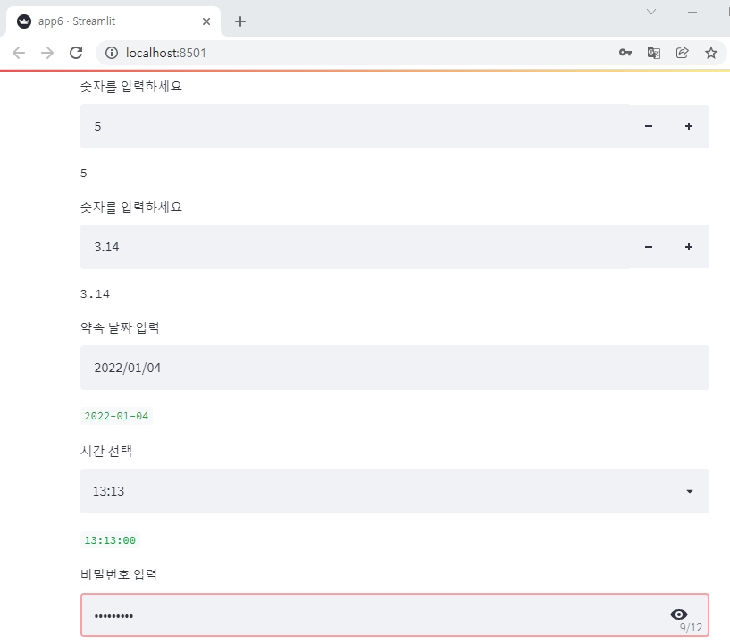 password = st.text_input('비밀번호 입력',type='password',max_chars=12)