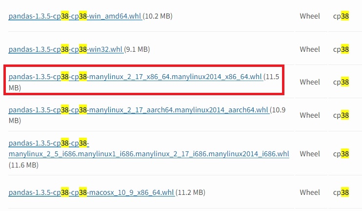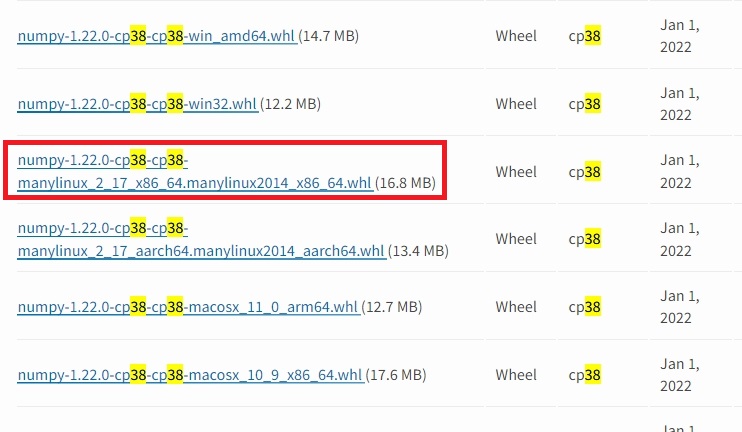 10. 파이썬 3.8이므로 위의 웹페이지에서 38 검색하고 그중에서 manylinux ... x86_64.whl 파일의 링크 주소 복사
