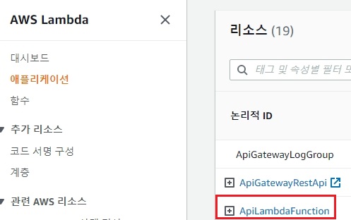 26. lambda 메뉴에서 애플리케이션으로 가서 만든 앱 선택후 밑에서 ApiLambdaFunction 클릭