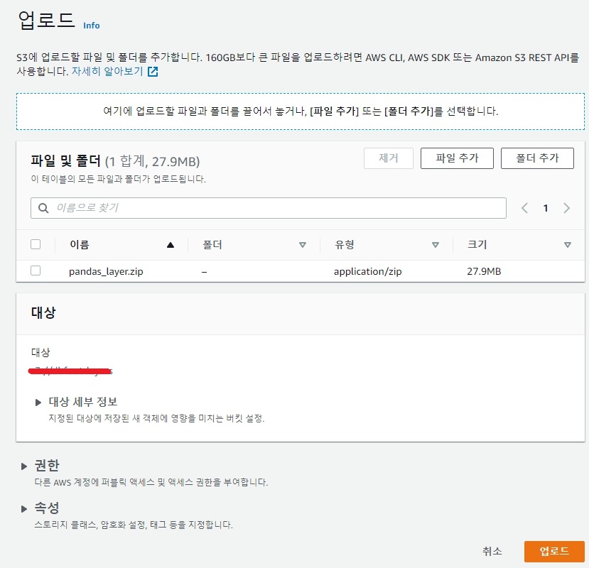 21. 버킷이 만들어지면 그 버킷으로 이동해서 위에서 만든 pandas_layer.zip 파일 업로드
