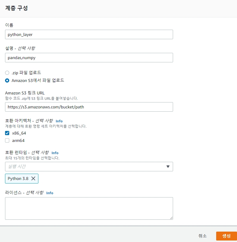 이름 적고 Amazon S3 링크 23번의 "객체 URL" 입력 x86_64,호환 런타임은 Python3.8