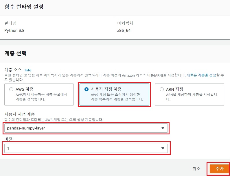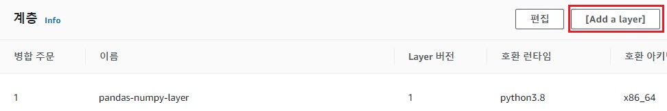 27. Layers를 클릭한후, Add a Layer, 사용자 지정 계층에서 방금 만든 Layer 선택 버전 python 버전 맞는거 선택