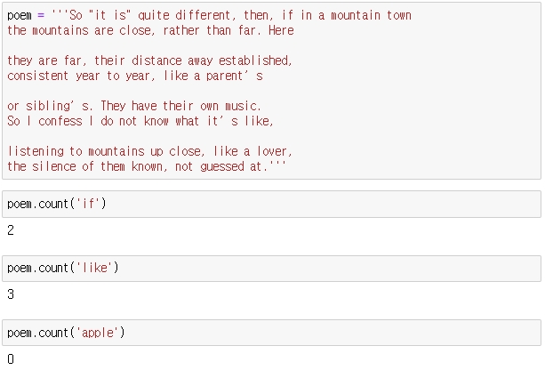 count 함수 안에 문자열을 넣어주면, 해당 문자열이 몇번 사용되었는가 횟수를 리턴합니다.