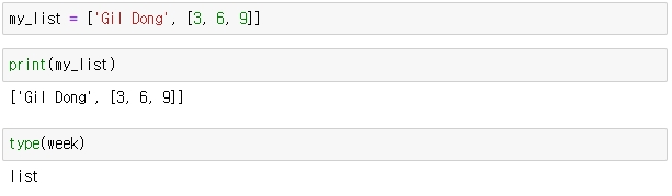 아래는 mixed datatypes , nested list ( 중첩 리스트 ) 를 생성하는 방법입니다.