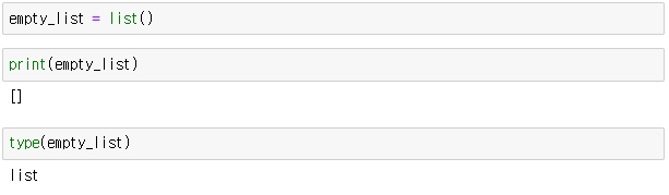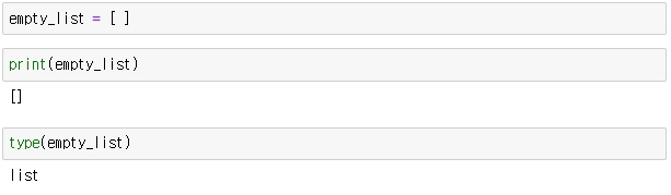 파이썬 리스트에서 비어있는 리스트, 즉 아무것도 없는 리스트는 아래처럼 두가지 방법으로 생성할 수 있습니다.