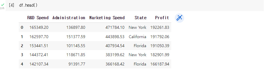 df=pd.read_csv('/content/drive/MyDrive/위치/50_Startups.csv')