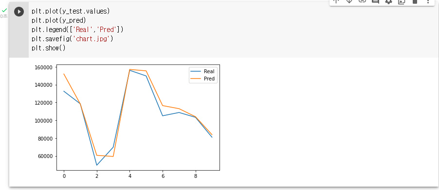 실제값과 예측값의 데이터를 차트로 나타내봅니다.