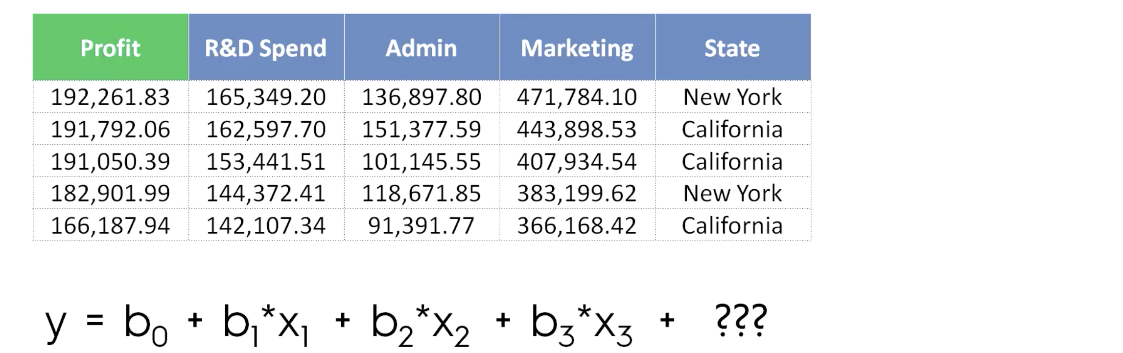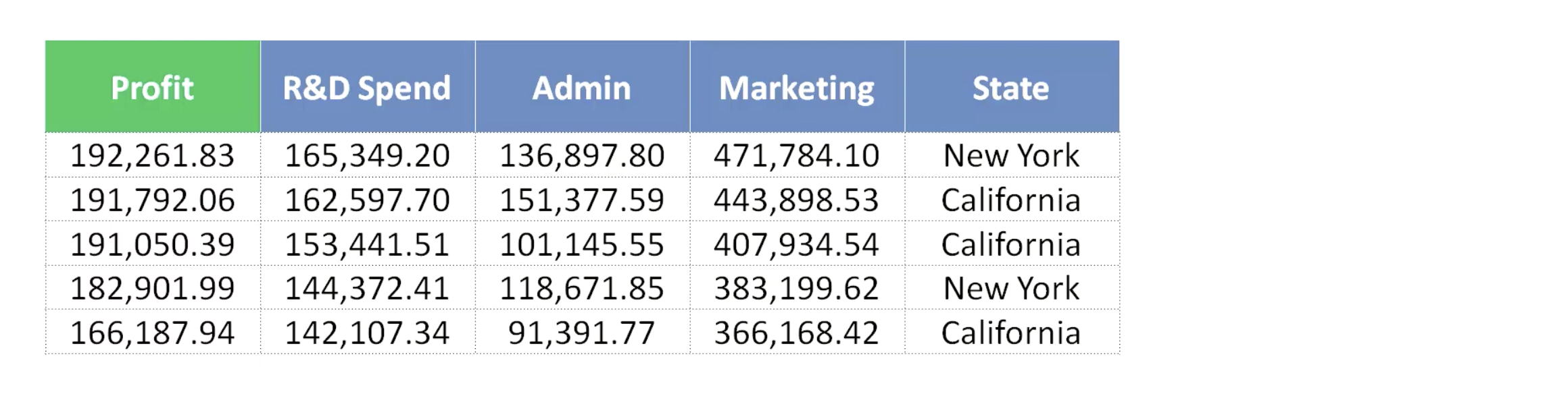 아래처럼, 여러개의 features를 기반으로, 수익을 예측하려 합니다.