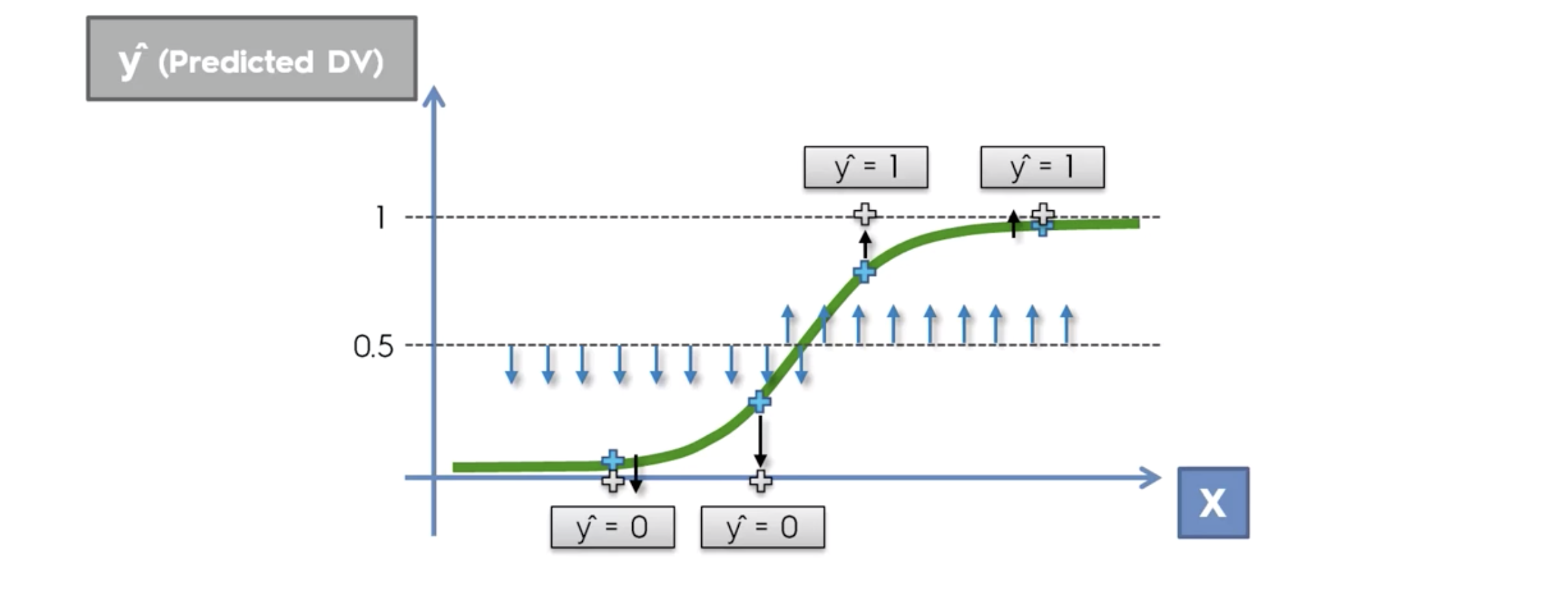최종 예측값은, 0.5를 기준으로 두개의 부류로 나눈다. 그 값은 0 과 1 이다.