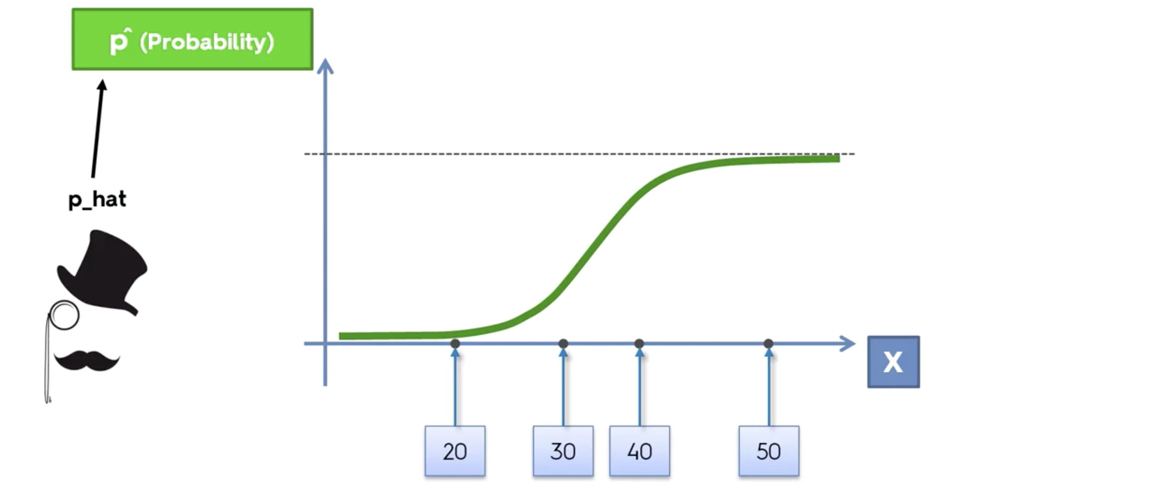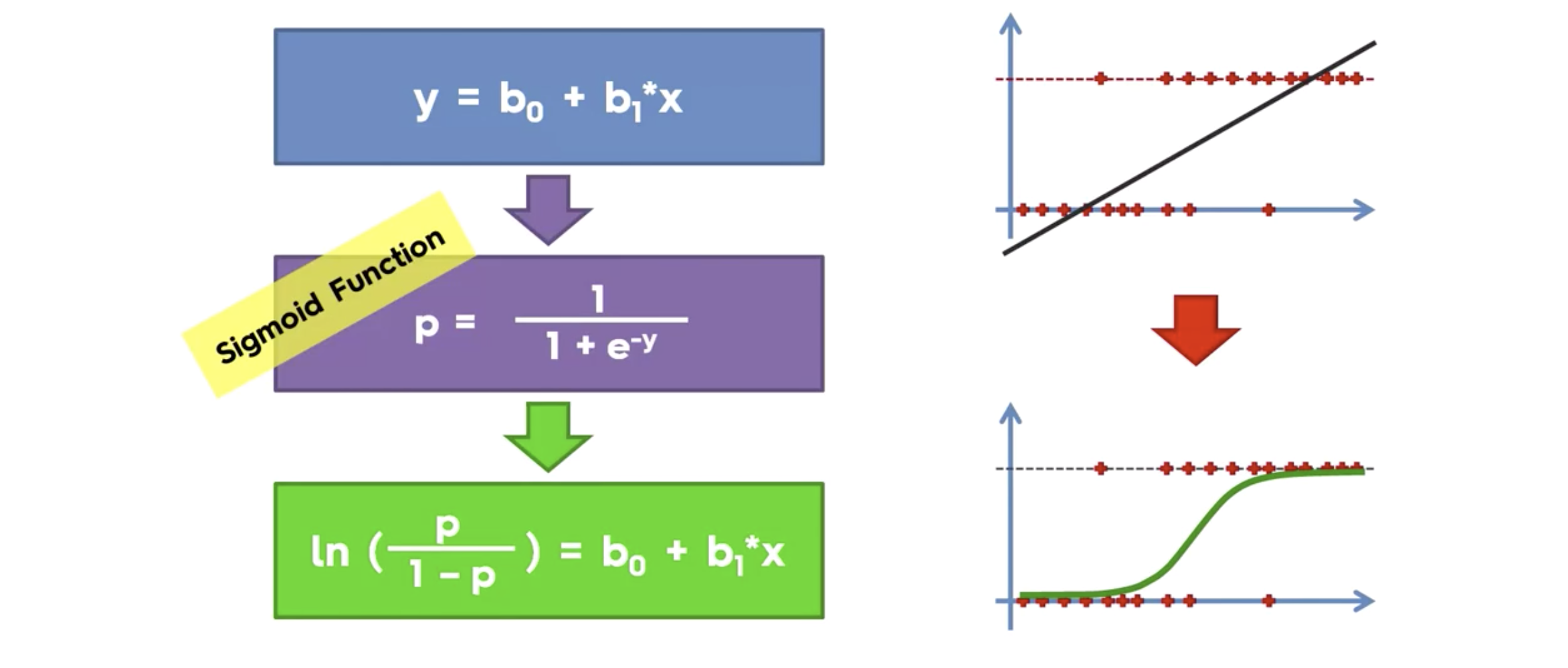 따라서 리니어 리그레션 식을, y 값을 시그모이드에 대입해서 , 일차방정식으로 만들면 다음과 같아집니다.