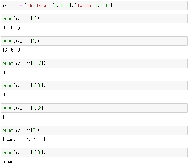따라서, 9 이라는 값을 가져오려면, my_list[1] 을 먼저 가져오면, [ 3, 6, 9 ] 이 되며,