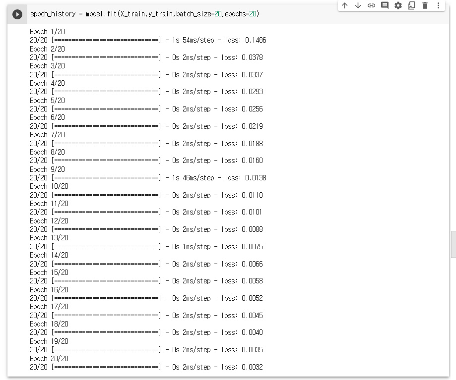 epoch_history = model.fit(X_train,y_train,batch_size=20,epochs=20)