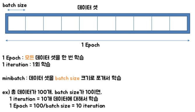 batch_size : 메모리의 한계와 속도 저하 때문에 대부분의 경우에는 한 번의 epoch에서 모든 데이터를 한꺼번에 집어넣을 수는 없습니다.