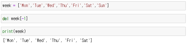 맨 끝의 값을 삭제하려면, 인덱스의 값을 -1 로 주면, 맨 끝의 값에 해당되므로, del week[-1] 을 이용하면 된다.