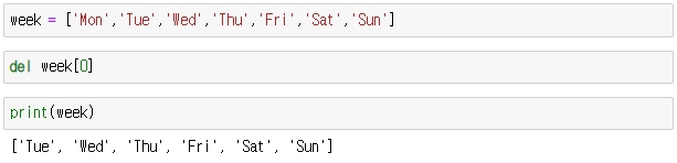 Mon은 인덱스(오프셋)가 0 이므로, del week[0] 이라고 하면 삭제됩니다.