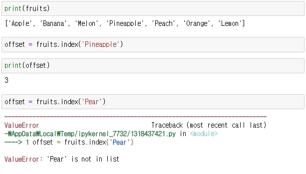 만약, 항목에 없는 'Pear'인덱스를 요청하면 아래처럼 Pear가 리스트에 없다고 에러가 발생합니다.