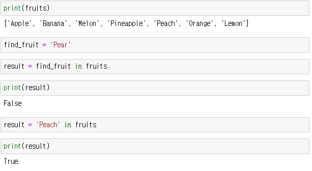 결과는 True 또는 False 가 리턴되며, True 이면 리스트에 해당 값이 존재하는 것이고,