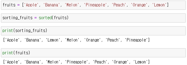 fruits 는 리스트 변수이다. 따라서 이 리스트를 정렬하려면, sorted(fruits) 를 하면 정렬된 리스트를 반환받을 수 있습니다.