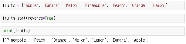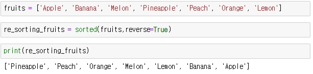 sorted 함수와 sort 함수 모두, reverse 라는 파라미터를 사용하면, 역순으로 정렬할 수 있습니다.