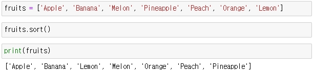 아래에서 fruits 는 리스트 변수이므로, fruits.sort() 라고 하면, fruits 리스트 자체를 정렬( sort ) 합니다.