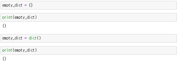 비어있는 딕셔너리(dict) 를 만드는 방법은 중괄호를 그냥 사용하거나, dict() 라고 사용하면 됩니다.