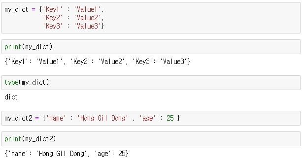 파이썬 딕셔너리(dict) 는 key 와 value ( 키, 밸류 ) 의 짝으로 되어있는 데이터를 저장하는 데 사용합니다.