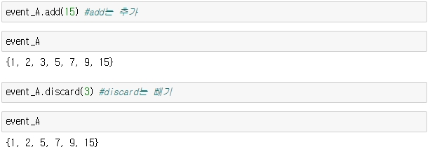 또 add()와 discard() 를 이용해 집합에 데이터를 넣고 뺼수 있습니다.