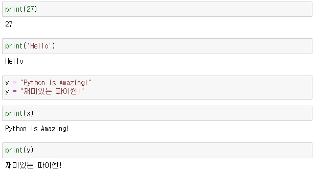 print 함수 사용법은 괄호 안에 변수나, 숫자, 문자열(문자열은 '," 사용)등을 넣어주면, 화면에 출력합니다.