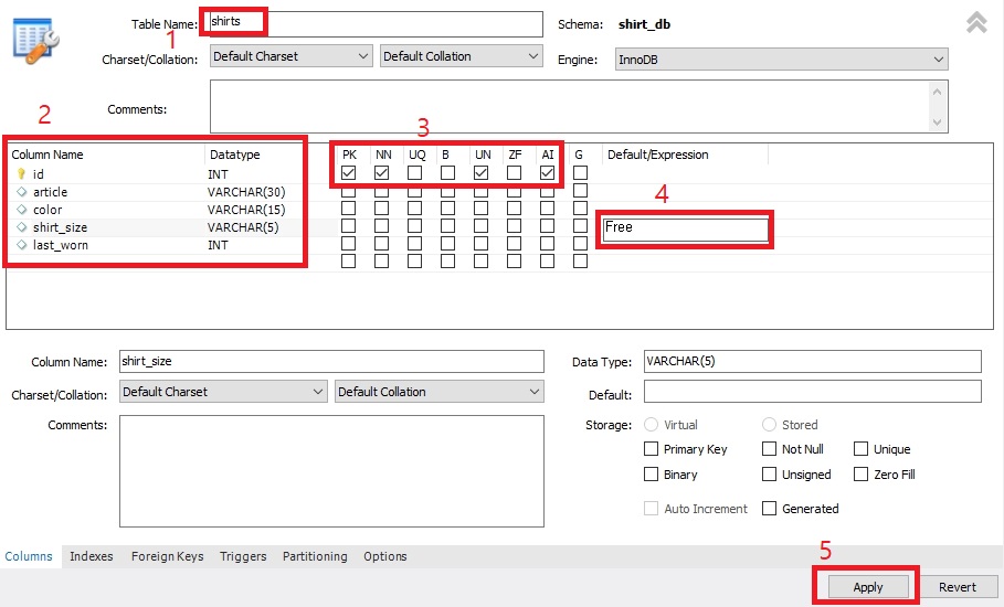 4. 해당 컬럼에 데이터를 입력하지 않으면 해당 자리에 설정한 기본값이 출력됩니다 (shirt_size에 값을 입력 안할시에 Free 출력)