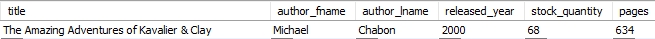('The Amazing Adventures of Kavalier & Clay', 'Michael', 'Chabon', 2000, 68, 634),