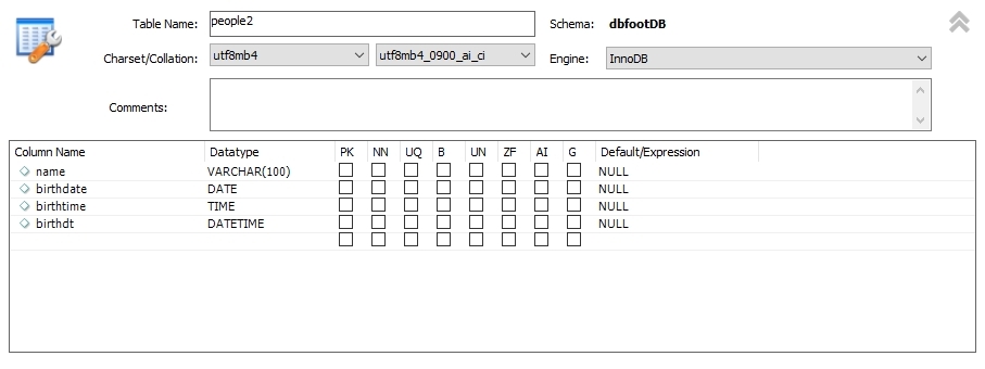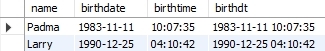('Larry','1990-12-25','04:10:42','1990-12-25 04:10:42');