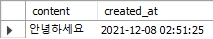 content에 안녕하세요만 넣었어도 created_at의 기본값인 now()가 자동으로 입력 되기 떄문에 데이터를