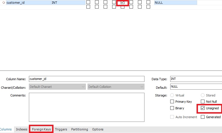 unsigned는 꼭 체크가 되어있어야합니다(customer의 id가 프라이머리 key로써 unsigned가 체크되어있기 때문)